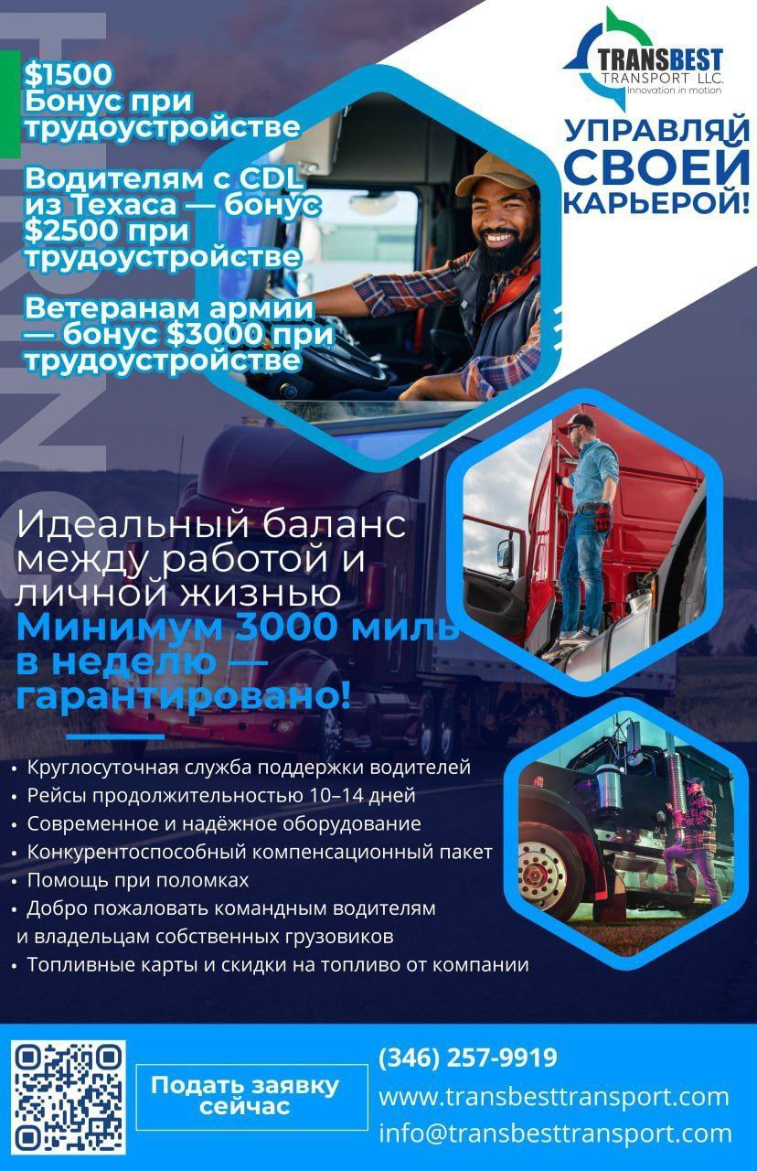 TransBest Transport. Требуется Водители CDL на Dry Van в Техасе. Отличные условия, баланс между домом и работой. Трипы 10-14 дней. Все диспетчера в США ,все бывшие водители. Ездим Midwest , South East.